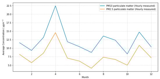 In particular, unusually high temperatures and solar radiation experienced in 2020 are likely to have increased NO2 photodissociation, decreasing its concentration and driving an increase in O3 (Figure 10) [,]. NO2 concentrations generally follow the expected seasonal cycle apart from an anomalous peak in April. With the population instructed to remain at home in the unusually warm weather in April, there was a significant increase in the number of barbeques (BBQs) held across the UK, with 21 million in April alone, constituting a 391% rise in the typical number of BBQs held in April []. This behaviour change may have contributed to this unexpected increase in NO2. This is supported by preliminary analysis of particulate matter (PM) concentrations at this site during the same year, which also show a significant peak in April (Figure 11).
