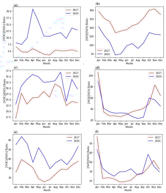 Time series plots of monthly averaged VOC/NOx and [NO]/[NO2] ratios, respectively, for LMR, (a,b), LE, (c,d), and CO, (e,f), for the years 2017 and 2020.