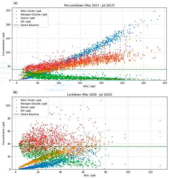 Scatter plot of nitric oxide, nitrogen dioxide, ozone and OX concentrations (in ppb) against NOx concentrations for (a) the time period covering the initial UK lockdown (March–July) in 2017, representing a pre-lockdown period, and (b) data collected during the initial UK lockdown in 2020. Green dashed line on each plot indicates the O3 baseline for the time period calculated as an average of O3 collected from Mace Head, Ireland.