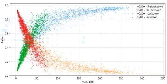 Scatter plot of NO2/OX and O3/OX concentration ratios across the time period covering the initial UK lockdown (March–July) in 2017, representing a pre-lockdown period, and during the actual lockdown in 2020.