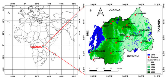 Study area on the map: (A) the geographical positioning of Rwanda within the East Africa region (longitude 28°–31° E, latitude 3°–1° S); (B) the identification and mapping of specific weather stations (red dots) across Rwanda’s landscape.