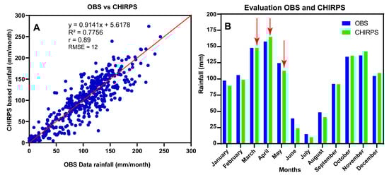 Evaluation of observation with CHIRPS monthly mean data: (A) indicates correlation between observation data from stations and the red line represents the regression between CHIRPS and observed rainfall. (B) shows mean annual rainfall cycle (mm) over Rwanda for observation data (blue) and CHIRPS data (green) from the period 1983–2021. The red arrows indicate the season being studied.