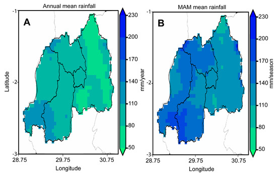 Climatology spatial distribution of (A) annual mean rainfall (mm/year) and (B) MAM seasonal mean rainfall (mm/season) over Rwanda 1983–2021.
