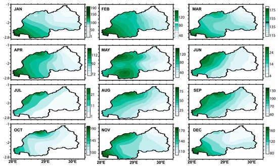 Figure 4 provides a comprehensive depiction of the spatial distribution of CHIRPS monthly rainfall (mm) across Rwanda, offering valuable insights into the seasonal patterns and geographical variations in precipitation. The highest rainfall amounts are concentrated in the southwestern region of the country, particularly in April and November. This aligns with the typical seasonal rainfall distribution observed in many tropical regions, where April often marks the onset of the rainy season and November represents a secondary peak in precipitation [40,47]. Conversely, the months of June, July, and August emerge as the driest months across Rwanda, exhibiting lighter shades on the map indicative of lower rainfall amounts during these periods. Additionally, the spatial distribution of rainfall in March, April, and May, followed by October, November, and December, showcases a clear pattern of seasonal variability across Rwanda, with these months consistently experiencing the highest levels of precipitation [48].