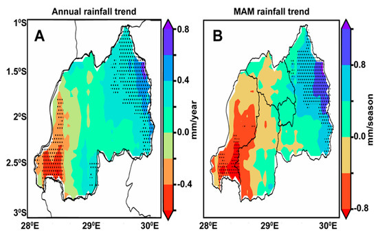 Geospatial trends in annual (A) and MAM seasonal (B) precipitation across Rwanda from 1983 to 2021, with significant trends in specific regions denoted by dots at a 95% confidence level.