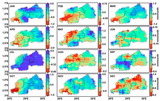 Moreover, November brings an increase in rainfall to the northwest, with the southwest continuing to experience a downward trend [43,48]. These findings underscore the complex interplay of climatic factors influencing rainfall distribution in Rwanda, emphasizing region-specific trends that manifest distinct patterns of change within the country’s diverse climatic zones. This spatial and temporal variability in rainfall trends points to the intricate dynamics of climate change impacts, necessitating targeted adaptation and mitigation strategies to address the specific needs and vulnerabilities of each region.