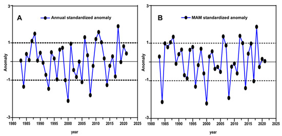 The investigation into the climatology and spatial distribution of rainfall over Rwanda during the MAM seasons of 1983–2021 reveals rainfall patterns that shed light on the country’s hydrological dynamics (Figure 3). The quantity of seasonal rainfall within the country varies each year between 80 and 220 mm for MAM (Figure 3A). Additionally, the observed annual rainfall variations, ranging from 250 mm to 600 mm, highlight the heterogeneity of precipitation across different regions of Rwanda (Figure 3B). Particularly notable is the concentration of maximum rainfall amounts in the southwest and northwest, contrasting sharply with the lower annual rainfall observed in the eastern part of the country, and these findings concur with previous studies [43,44]. This spatial variability in rainfall distribution highlights the influence of geographical features such as mountains and elevation gradients, which can significantly impact precipitation patterns [45,46]. Moreover, the moderate levels of rainfall ranging from 50 to 350 mm observed in the central part of Rwanda suggest a transitional zone between the more arid eastern regions and the wetter western areas. The lowest rainfall amounts recorded during the MAM season in the eastern part of the country further accentuate the disparities in precipitation distribution [46]. The observed southwest to northeast slant in rainfall distribution implies a gradient that may be influenced by regional climatic drivers such as prevailing wind patterns and topographical features [42].