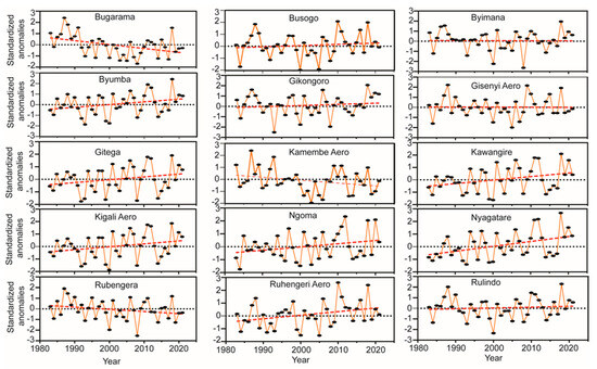 Figure 8 provides a comprehensive overview of the variation in rainfall patterns in Rwanda from 1983 to 2021, covering a detailed month-by-month analysis from January to December. This extensive period of observation uncovers significant insights into the climatic variability experienced across the country, highlighting both wet and dry years in terms of monthly rainfall. The analysis, focused on 15 meteorological stations, documented varying trends of precipitation, highlighting the spatial diversity in climatic responses across the region. A handful of stations such as Rulindo, Gisenyi Aero, Byimana, Busogo, and Gikongoro present stable precipitation patterns, devoid of significant long-term changes, which is a rarity in the context of broader climatic fluctuations [28,52,53]. Conversely, stations like Bugarama and Nyagatare signify the extremes of these temporal variations, with Bugarama experiencing a marked decline in rainfall, whereas Nyagatare sees a noticeable uptick. These contrasting trends highlight the localized and heterogeneous nature of rainfall variability within Rwanda, emphasizing the need for region-specific climatological studies [42,52,54,55].
