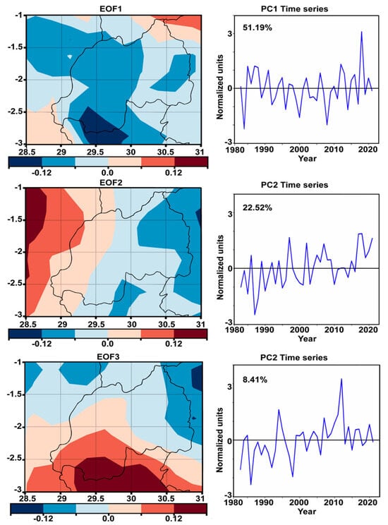 The analysis of EOF applied to rainfall variability during the MAM season over Rwanda from 1983 to 2021 reveals a detailed understanding of spatial and temporal rainfall patterns across the region (Figure 9). Utilizing EOF1, EOF2, and EOF3 modes to dissect the dataset, it becomes evident that these modes encapsulate a significant portion of the total variance in seasonal rainfall, with EOF1 accounting for 51.19%, EOF2 for 22.52%, and EOF3 for 8.41%. This hierarchical decomposition of rainfall variability stresses the dominant influence of EOF1, which is characterized by a distinctive west–east precipitation gradient across the country as shown in previous studies [56,57]. Specifically, EOF1 delineates a pattern of weak to strong positive loadings in the western, northern, and southern sectors, contrasted by general negative loadings across the eastern regions. This spatial configuration suggests a pronounced dipole effect within the country’s climatic system, likely driven by complex interactions between topographical features and atmospheric circulation dynamics [58,59].