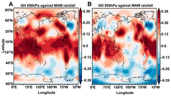 The correlation between geopotential height at (A) 500 hpa upper level and (B) 850 hpa low-level from 1983 to 2021.