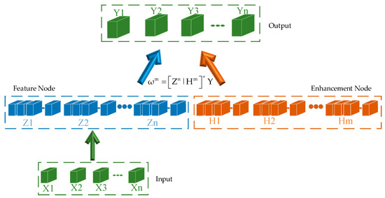 The random vector function link neural network serves as the foundation for BLS [24] construction. On the one hand, feature nodes in the BLS network are created via feature mapping. However, augmentation nodes are added to the BLS network in order to boost its nonlinearities. The BLS structure diagram is shown in Figure 1. As the first step, the input data X are sent to the input layer, and feature mapping is performed to obtain the mapped feature , where are a randomly generated feature layer weight. represents the function calculation formula. The first n sets of feature mappings are concatenated as . The mapped features are augmented in the second step to obtain the augmented node , where and represent the weights randomly generated with the enhancement layer, and represents the function calculation formula. The first m groups of enhanced nodes are . The third step feeds the results of mapped features and enhanced nodes into the output layer to obtain