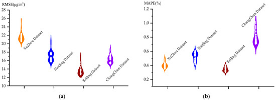 With the development of machine learning, deep learning algorithms are gradually being applied to air quality prediction. Zhang et al. [15] predicted the concentration of Hong Kong’s air quality through an extreme learning machine (ELM) based on eight types of air quality data from two monitoring stations in Hong Kong. The model has achieved good results in predicting air quality. Jiang et al. [16] improved the pigeon-inspired optimization algorithm by using the particle swarm optimization algorithm and then used the improved algorithm to optimize ELM. The Air Quality Index of Harbin city is used to verify the proposed method, and the results show that the method has good forecasting effect. Qiao et al. [17], based on RF models, designed a model combining the improved ant colony algorithm, and a BP neural network was used to predict the AQI data; the experimental results showed that the model achieved better results than the single RF model. Feng et al. [18] used the RNN model to predict the AQI in the first 24 h, and compared the experimental results with an RF model, finding that the prediction accuracy of the RNN model was higher. Belavadi et al. [19] combined Long Short-Term Memory (LSTM) with an RNN model to construct the LSTM–RNN model to complete the air quality prediction, and the prediction results have a high accuracy. In order to anticipate PM2.5 levels in Beijing, Zhang et al. [20] created a deep learning model that combines Variational Mode Decomposition (VMD) with Bidirectional Long Short-Term Memory (BiLSTM). This model greatly increases prediction accuracy. These models do a decent job of capturing the temporal characteristics of the data, but they are not as good at capturing the spatial correlations. Convolutional Neural Networks (CNN) were utilized by Qin et al. [21] to extract spatial features from raw data. These features were then fed into an LSTM model for prediction, yielding accurate forecasting outcomes. The Multi-Scale Spatial–Temporal Network (MSSTN), a novel deep Convolutional Neural Network model created by Wu et al. [22], increased prediction accuracy. Han et al. [23] proposed a multi-adversarial spatiotemporal recurrent graph neural network (masterergnn), which effectively suppressed the observation noise caused via spatiotemporal modeling and further improved the prediction accuracy. Scientists have made significant progress in the area of air quality prediction using deep learning. But as the networks get more complicated, there are also more hyperparameters to tweak, which means that training takes longer and uses more resources. Furthermore, tiny- to medium-sized datasets are not as well modeled via deep learning systems.