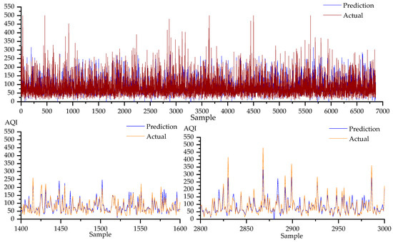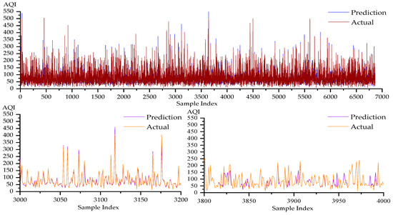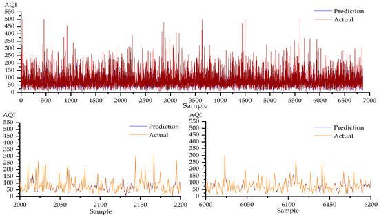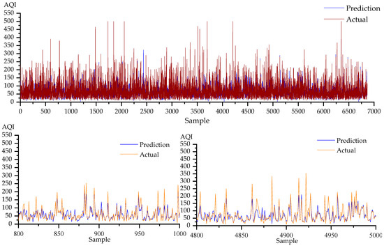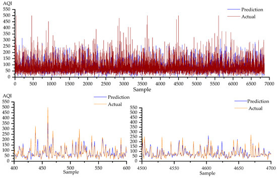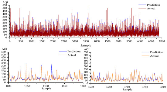 Figure 8 shows that the RMSE of the CC-SSBLS method for the four datasets has an up-and-down difference of about 2 μg·m−3, the MAPE has an up-and-down difference of approximately 0.1%, the MAE has an up-and-down difference of approximately 2 μg·m−3, and the R2 has an up-and-down difference of approximately 0.08. The upward and downward fluctuations of the evaluation indexes of the CC-SSBLS algorithm for the four datasets are further reduced compared to the SSBLS algorithm, and the stability of the prediction results is further improved. The best results are obtained with the CC-SSBLS method for the four datasets at iteration windows 18, 18, 20, and 35, where the RMSEs are 11.94 μg·m−3, 8.68 μg·m−3, 8.75 μg·m−3, and 11.73 μg·m−3, respectively. From the results of several evaluation indicators, it is obvious that the prediction effect of CC-SSBLS algorithm is better than that of the SSBLS algorithm. Figure 9 illustrates the prediction effect of the CC-SSBLS algorithm for the four datasets for air quality prediction at the optimal window through the above experimental analysis, using the Xuzhou dataset as an example. The upper and lower sets of data graphs show the prediction curves for the entire dataset, while the lower set shows the localized prediction curves.