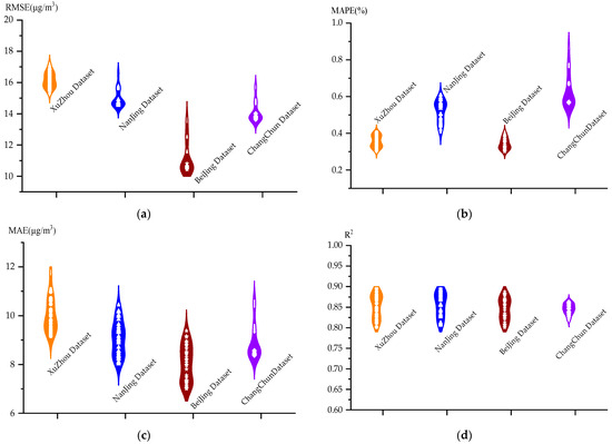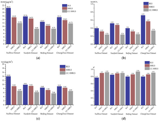 Using the Xuzhou dataset as an example, it can be seen from the table that the CC-SSBLS model value for RMSE is 11.94 μg·m−3, which is the lowest value among multiple models and 3.31 μg·m−3 less than that of SSBLS. The CC-SSBLS model value for MAE is 6.89 μg·m−3, the lowest of various models and 2.30 μg·m−3 less than that of SSBLS. The CC-SSBLS model for MAPE had a value of 0.24%, the lowest of multiple models and 0.08% less than SSBLS. The greatest value among several models for R2 is 0.92 for the CC-SSBLS model, which is 0.02 more than the value for SSBLS. Thus, the CC-SSBLS model outperforms multiple alternative models for each assessment criteria. In the same way, the CC-SSBLS model performs better than the other models for the following three datasets.