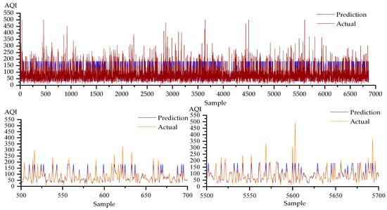 The distribution of violins is depicted in the above figure. Each violin stands for the range of outcomes from the BLS model’s assessment metrics on a dataset, and by comparing each violin, one can determine the stability of the BLS model across all datasets. The evaluation metrics presented in Figure 4 demonstrate that the variation in the RMSE of the BLS algorithm on the four datasets is around 5 μg·m−3, the MAPE is approximately 0.4%, the MAE is approximately 4 μg·m−3, and the R2 is approximately 0.1. It is evident from the above results in the figure that the prediction effect is unstable and the BLS algorithm exhibits significant upward and downward variations on the four datasets. Based on the experimental findings, it is evident that out of all the iteration windows, the BLS algorithm performs optimally on the four datasets on windows 17, 12, and 17, during which the corresponding RMSEs are 20.61 μg·m−3, 15.76 μg·m−3, 12.67 μg·m−3, and 15.31 μg·m−3. It is evident from the findings of multiple evaluation indices that the BLS algorithm has a poor prediction effect. The prediction effect of the BLS algorithm for the Xuzhou dataset is displayed in Figure 5, which contains upper and lower sets of data graphs, with the upper set indicating the prediction curves for the whole dataset and the lower set indicating the localized prediction curves. This is achieved through the above experimental analysis, using the Xuzhou dataset as an example of air quality prediction at the optimal window.