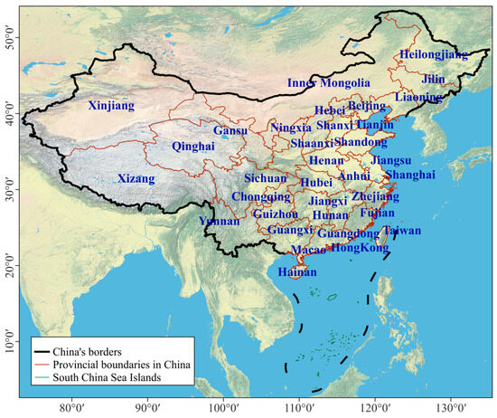 The observed daily page views of city weather forecasts from 1 March 2020 to 31 August 2023 were obtained from China Weather (www.weather.com.cn). The page views were desensitized. Meteorological warning information, including elements such as accurate hourly warning release time, meteorological risk type, warning level, release status, and warning content, was obtained from the National Early Warning Centre of China (www.pmsc.cn). The warning levels includes four levels: red, yellow, blue, and green. The release status of warning information is divided into three categories: initially released, updated, and released. During 1 March 2020 to 31 August 2023, the National Early Warning Centre of China issued a total of 23 types of meteorological warning information (Table 1). The locations of China and its 23 provinces, 5 autonomous regions, 4 municipalities directly under the central government, and 2 special administrative regions are shown in Figure 1.