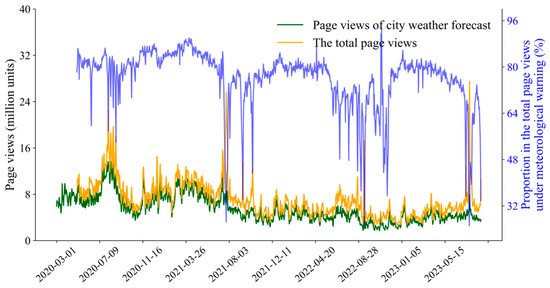 Throughout the research period, the proportion of city weather forecast page views fluctuated between 24.1% and 93.3% of the total page views (Figure 2). Notably, city weather forecast page views constituted over 50% of the total page views 96% of the time, exceeding 60% 93.7% of the time, and surpassing 80% 39.7% of the time. Evidently, the degree of attention towards city weather forecasts served as a direct indicator of the public’s level of interest in weather conditions. Between March 2020 and August 2023, city weather forecast page views fluctuated between 1.74 million units on 29 October 2022 (Saturday) and 13.64 million units on 3 August 2020 (Monday), as depicted in Figure 2. Notably, the lowest number of page views was predominantly observed in October 2022, whereas the peak number of views clustered around August 2020. Mirroring this trend, the overall page views for China weather were also subdued in October 2022. Despite missing data on the total page views for March and April 2020, it is plausible that higher engagement occurred in early August 2020. This surge in public interest in meteorological information can be partially attributed to the influence of Typhoon Hagupit, which made landfall in China during that period. Hagupit exhibited several notable characteristics: its formation occurred less than 1000 km from the coastline, and it progressed from identification to landfall in under three days. Its rapid intensification posed challenges for predicting and mitigating typhoon-related risks and impacts. Furthermore, Hagupit’s level 7 wind circle had a radius of less than 300 km before landfall, indicating concentrated energy and a compact rainband structure. These aspects captured significant public attention. Beyond the primary flood season of August 2020, the city weather forecast consistently maintained elevated page views from July through August of 2021 to 2023. This suggests that the prevalence of heat waves, typhoons, severe convective weather, and geological hazards triggered by heavy rainfall during the flood season heighten public awareness and engagement with weather forecasts.