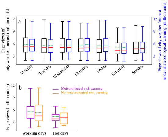 The city weather forecast page views with and without meteorological disaster risk warnings. (a) represents the weekly features and (b) shows holiday and non holiday features. The red solid line and green dotted line represent the median and mean of page views, respectively. The 25th and 75th percentiles are the bottom and top boundaries of a box; minimum and maximum are the bottom and top whiskers of a box.