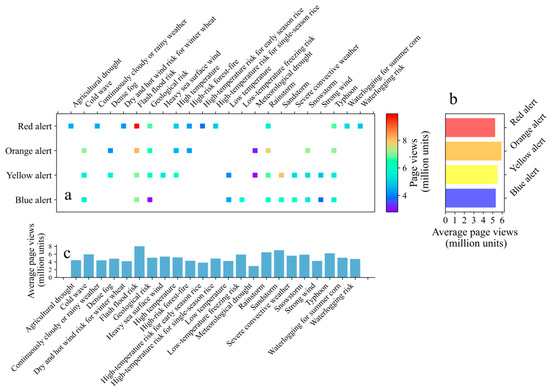 Under various red meteorological disaster warnings in China, the public’s primary concerns were flash floods, typhoons, and geological risks, as evident from Figure 4a. In each of these scenarios, the daily average page views exceeded 6.2 million units. Notably, early-season rice’s high-temperature risk received the least attention under the red alerts. During orange alerts, flash floods, rainstorms, typhoons, snowstorms, and cold waves dominated the public’s attention. In contrast, meteorological droughts and dense fogs garnered less interest. This may be because these they are usually mild and not as violent as rainstorms, snowstorms, or typhoons. In particular, drought disasters are caused by low precipitation for a long time. For yellow alerts, sandstorms were the most notable concern, while meteorological droughts remained relatively unheeded. Under blue alerts, there was no significant variation in the public’s focus across various meteorological disasters, with no particular disaster attracting excessive attention. It was unexpected to see that the public remained relatively unperturbed by the blue warnings for geological risks and strong winds. Comparing across alert levels, Figure 4b reveals that the city weather forecast page views were higher during orange and yellow meteorological alerts than under red alerts. Specifically, the public was more attentive to city weather forecasts when the warnings involved flash floods, sandstorms, rainstorms, typhoons, cold waves, or low-temperature freezing risks, as seen in Figure 4c. Conversely, meteorological drought warnings drew the least interest when it came to the city weather forecasts.