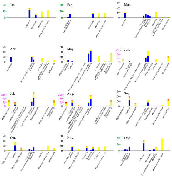 The number of occurrences of meteorological disaster risk warnings in each month. The red, orange, yellow, and blue bar charts represent the number of occurrences of corresponding meteorological risks under the corresponding color warning levels.
