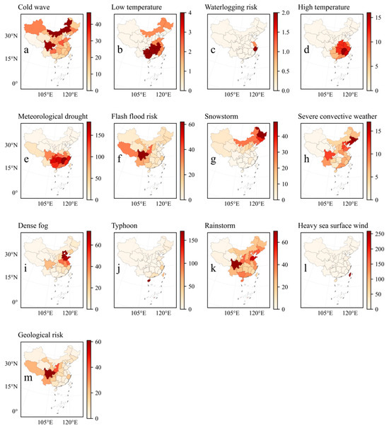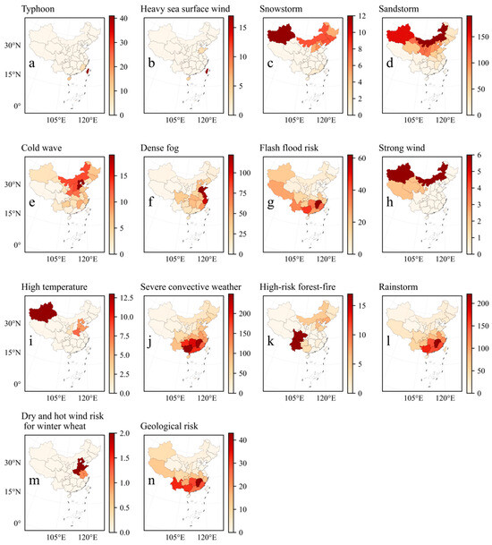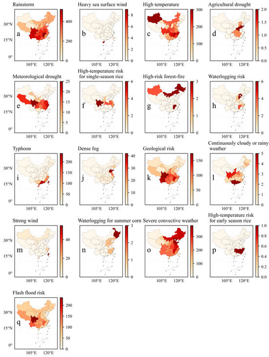 China’s natural disasters are diverse and widely distributed, and their occurrence is closely related to various factors such as geographical location, climate characteristics, topography, climate change, and human activities. The southern and southeastern regions are close to the ocean and are significantly affected by monsoons, often suffering from severe convective weather events, floods, and typhoons [36,37,38]. At the same time, the geological risks in these areas cannot be ignored, with frequent disasters such as landslides and mudslides. In contrast, the northern region is more often plagued by sandstorms, high temperatures, and drought, which are related to natural conditions such as arid climates, desertified land, and strong winds [39,40]. In the western region, the terrain is complex and mountainous, and geological disasters such as landslides and debris flows are common [41]. At the same time, floods and rainstorms are also frequent visitors in this region. In addition, the eastern coastal areas also need to address the challenges of heavy fog and marine meteorological disasters [42,43]. The central region may be threatened by multiple disasters, such as rainstorms, heavy fog, and low temperatures. Therefore, it is crucial to develop corresponding prevention and response measures based on the characteristics of disasters in different regions in order to reduce the losses caused by disasters and ensure the safety of people’s lives and property.