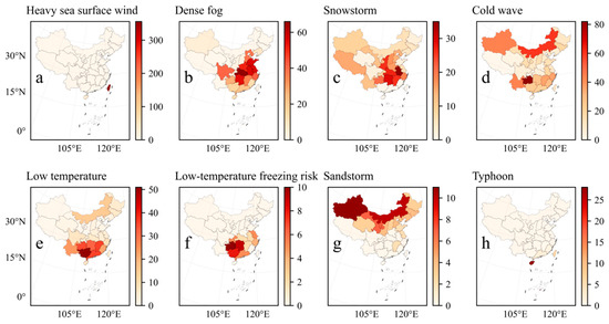 During the spring season, spanning from 1 March 2020 to 31 August 2023, a total of 14 distinct meteorological warnings were issued (Figure 6). The most prevalent warnings were directed towards severe convection weather events in southern China, particularly affecting regions such as Jiangxi, Guangxi, and Hunan Province. Additionally, rainstorms along the southeast coast, predominantly in Jiangxi and Guangxi; sandstorms in northern regions, especially in the Xinjiang Uygur Autonomous Region and the Inner Mongolia Autonomous Region; and dense fog along the east coast, notably in Shandong, Zhejiang, and Jiangsu Province, were also frequently warned against. Following these, warnings on flash flood risks, particularly in Jiangxi and Guangxi Province, and geological risks in western and southern China, especially in Jiangxi, Yunnan, and Guangxi Province, were also commonly issued. Typhoon warnings along the southeastern coast were also a significant part of the meteorological warnings during this period. Moving into the summer season, a total of 17 types of meteorological warnings were released (Figure 7). Among these, rainstorms, particularly affecting Jiangxi, Sichuan, and Yunnan Province; severe convection weather events, especially in Hebei, Shandong, Liaoning, Jilin, and Heilongjiang Province; and high temperatures, notably in the Xinjiang Uygur Autonomous Region, Zhejiang, and Jiangxi Province, were the most frequent meteorological disasters. Flash flood risks in various parts of China, including Sichuan, Yunnan, and Jiangxi Province, and typhoons along the southeast coast of China were also commonly warned about. Additionally, geological risks in southwestern China, especially in Yunnan and Sichuan Province, were a frequent occurrence during the summer season, leading to regular meteorological warnings. During autumn, a total of 13 types of meteorological warnings were issued (Figure 8). The most prevalent meteorological risk warnings included heavy sea surface winds along the southeast coast of China, meteorological droughts in the southern regions, and typhoon warnings, specifically on Hainan Island. Additionally, dense fog warnings, particularly in Shandong and Hebei Province; rainstorm warnings in Sichuan and Shandong Province; and flash flood risks in Sichuan, Shaanxi Province, and the Xizang Autonomous Region, as well as geological risk warnings in the same regions, were also commonly observed in autumn. In contrast to the other three seasons, winter had the fewest meteorological disaster warnings, totaling only eight types (Figure 9). During this period, the primary meteorological risks with the highest number of warnings issued included heavy sea surface winds along the southeastern coast of China; cold waves affecting most parts of the country, especially Guizhou Province, the Inner Mongolia Autonomous Region, Yunnan Province, and the Xinjiang Uygur Autonomous Region; low temperatures in southern China, particularly in Guangxi Province; and dense fog in central and eastern China, with a notable concentration in Hubei Province.