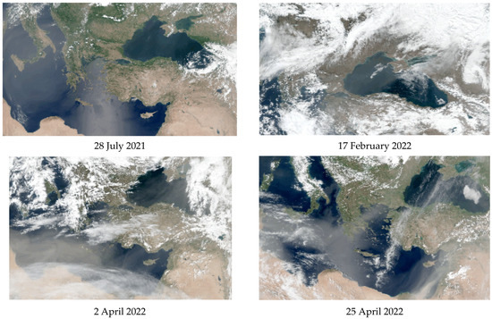 Satellite images of QuasiTrueColor VIIRS for the studied dates (source: https://oceancolor.gsfc.nasa.gov/ [accessed on 15 April 2023]).