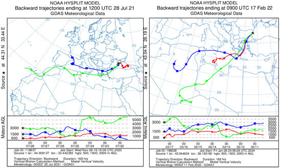 According to satellite images, dust air flow movements were confirmed on 27 July 2021 (afternoon), 28 July 2021, 17 February 2022, 2 April 2022 that were visualized as plumes of white or yellow color mainly from the south-west direction (Figure 1). Over the Black Sea region on 5 November 2021, heavy clouds were observed so it is not possible to confirm or deny the presence of dust from the images but based on the back trajectories, the movement was from Sahara Desert. No anomalies were observed on satellite images for the rest of the selected dates, but sometimes a slight cloud cover was present. Figure 2 confirms that for the selected days, the source of the aerosol is the Sahara Desert.