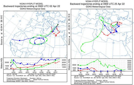 The sources of aerosol transport can be analyzed using the results of modeling the back trajectories of air flow movement using the HYSPLIT V1 software package (Integrated hybrid Lagrangian trajectory model for a single particle) developed by the Air Resources Laboratory (ARL), (https://www.ready.noaa.gov/HYSPLIT.php [accessed on 21 June 2023]). To confirm the presence of a dust aerosol over the Black Sea, in addition to satellite data and analysis of optical characteristics based on in situ data, the HYSPLIT model data were used [54]. A comprehensive analysis of the described data makes it possible to predict the region of aerosol origin (source) and visualize the stratification of various types of atmospheric aerosols using CALIPSO satellite data [55,56]. Additionally, to confirm the presence of dust, the System for Integrated modeLing of Atmospheric composition (SILAM v.5.7/5.7.1) was used [57,58].