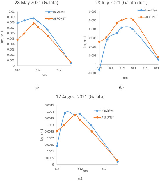 In situ and satellite values of Rrs(λ) for (a) 28 May 2021 (clear excess of satellite Rrs(λ)), (b) 28 July 2021 (dust aerosol with low satellite Rrs(λ)), (c) 17 August 2021 (satellite Rrs(λ) overestimated or underestimated).