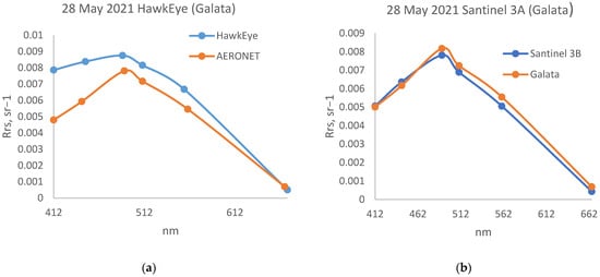 Remote sensing reflectance on 28 May 2021 for Galata_Platform station according to HawkEye (a) and Sentinel 3A (b) data.