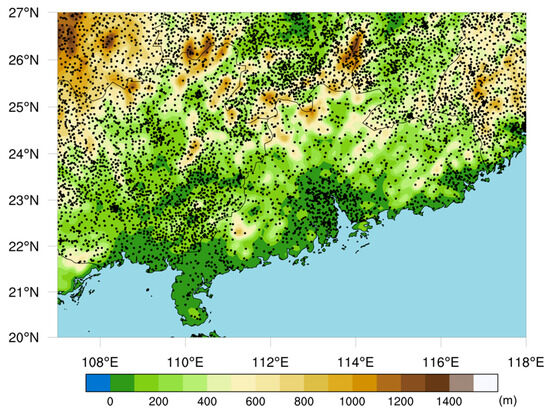 The study area of this research is located in Southern China, primarily encompassing the provinces of Guangdong and Guangxi and surrounding areas, as shown in Figure 1. The latitude and longitude coordinates range from 20° to 27° N and 107° to 118° E, respectively. This region is influenced by a subtropical monsoon climate, leading to frequent occurrences of short-term heavy rainfall. The frequency of short-duration heavy rainfall and the maximum hourly rainfall intensity in this region are among the highest in China. Additionally, the southern region boasts a well-established meteorological detection network, providing a wealth of high-quality meteorological data. The densely populated urban agglomerations in the Guangdong–Hong Kong–Macao Greater Bay Area are highly susceptible to the impacts of heavy rainfall, which can significantly affect agriculture, industry, and the service sector. Therefore, effective and accurate approaching precipitation forecasting is crucial for the daily lives and economic development of the people in this region.