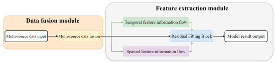 This section aims to introduce the overall network of ResSTConvNet, which mainly includes the attention weight allocation module, the spatiotemporal feature information flow, and the residual fitting module. The overall framework is illustrated in Figure 2. The data pass through the data fusion block, undergo feature extraction, and are merged in the residual fitting block to obtain the final prediction results. The details of these three modules are elaborated in the following sections.
