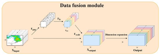 The module for integrating multiple data sources. Fgap refers to the pooling operation conducted globally across the spatial dimensions. Ffc indicates the process of passing the pooled features through fully connected layers. Fscale involves assigning weights to the features based on their importance. After completing weight allocation, the data undergo time dimension expansion before being forwarded to the feature extraction module.
