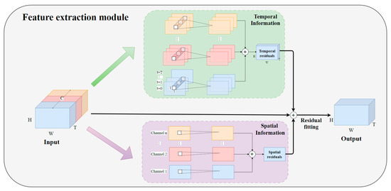 Tran et al. (2018) proposed a solution involving separable three-dimensional convolution [27], decomposing 3D convolution into R(2 + 1)D, which is accomplished by multiple convolutions after separation. They introduced ReLU layers between each convolution block to increase the network’s nonlinearity and performed feature extraction in steps to enhance network complexity. Based on this, the feature extraction module in this paper also decomposes 3D convolution. The original three-dimensional convolution is split into two simultaneous steps: the temporal feature information flow and the spatial feature information flow. After performing the corresponding convolution calculations, feature fusion is carried out, effectively separating the temporal and spatial feature extraction components. The main structure is illustrated in Figure 4.