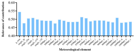 To verify whether the use of multisource data inputs improves the final results, the average contribution value of each channel is visualized. During the testing phase, we first initialized an array to accumulate attention, summing up the corresponding contribution values of each batch operation. After evaluating the entire test dataset, we calculated the absolute average of the results. The outcome, as shown in Figure 5, illustrates that the contribution percentages of all 26 channels to the results are between 0.45 and 0.55. This validates our experimental hypothesis that there is a strong correlation between air pressure, temperature, humidity, wind speed, and precipitation. Utilizing multisource data exhibits significant advantages over single-observation predictions.