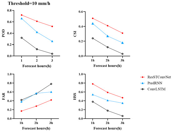 Due to the poor performance of U-net and ResNet with a threshold of 10, showing almost no ability to predict heavy rain, the evaluation at a threshold of 10 only includes the remaining three models with better performance, as shown in Figure 6. From Figure 6, it can be observed that as the forecast time increases, the POD, CSI, and HSS of all three models gradually decrease, with ResSTConvNet consistently outperforming PredRNN and ConvLSTM in these three metrics. The FAR also increases with forecast time, with ResSTConvNet and PredRNN showing very similar forecast results in the first two hours but ResSTConvNet surpassing PredRNN in the third hour. The trends in the four metrics changing over time align with previous experimental analysis results. It can be observed that when the threshold is set to 10, the superiority of our proposed ResSTConvNet model is fully demonstrated. It outperforms both PredRNN and ConvLSTM models across all four evaluation metrics. PredRNN’s prediction for the first hour is somewhat comparable to the ResSTConvNet, but the gap widens gradually in the subsequent two hours, displaying its instability. Although ConvLSTM demonstrates good prediction ability for precipitation occurrence, its capability to predict heavy rain significantly decreases, which is closely related to the architecture of the network.