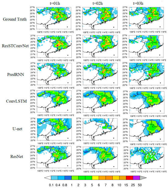 In addition to determining the presence or absence of precipitation, assessing precipitation intensity is also crucial in precipitation forecasting. Therefore, we adopted two performance evaluation metrics: MAE and RMSE. From Table 4, it can be observed that except for PredRNN, which has a slightly smaller MAE than ResSTConvNet at 1 h, ResSTConvNet outperforms other baseline models in all other timeframes. Consistent with qualitative assessments, the advantage of ResSTConvNet becomes more pronounced as the forecast lead time increases. In the 1 h prediction, ConvLSTM, which performs well in TS scores, shows relatively high values in both continuity scores. Meanwhile, U-net and ResNet have MAE and RMSE values smaller than ConvLSTM, slightly inferior to ResSTConvNet. This suggests that these models excel in capturing spatial features but start to weaken compared with ConvLSTM at 2 and 3 h, indicating the strong temporal correlation in meteorological element predictions. Pure convolutional models lack the fitting of temporal information.