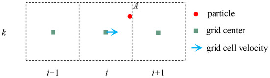 where Ui represents the velocity of grid point i, Δx denotes the grid spacing, and Wi indicates the weighting factor of grid point i on particle A. The distance between particle A and grid point i is denoted as dA,i, with dA,i = xi − xA. In Figure 2, there are two grid points, i and i + 1, near particle A, thus dA,i < 0 and dA,i+1 > 0.