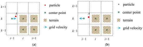 As shown in Figure 4, the grid point (i − 1,k) represents an air grid point, while the grid point (i,k) represents a terrain grid point with a velocity of 0. The velocity corresponding to grid point (i,k) is denoted as ui,j. In Figure 4a, when ui−1,j > 0 and ui,j = 0, based on the velocity difference of neighboring grid points around particle A, it can be inferred that particle A is under compression. Similarly, in Figure 4b, when ui−1,j < 0 and ui,j = 0, based on the velocity difference of neighboring grid points around particle A, it can be inferred that particle A is under expansion. According to Equation (13), the deformation gradient of particle A can be computed for both states depicted in Figure 4a,b.