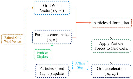 Specifically, in the Euler–Lagrange method, the motion state of particle groups is first computed, and then this motion information is fed back to the atmospheric background grid [17]. Based on the spatial force distribution characteristics of the background grid, the motion characteristics of particles are further derived [18]. This method achieves numerical simulation and prediction of atmospheric phenomena through the interaction between particles and the grid.