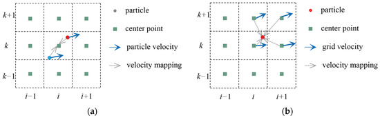 Figure 6a illustrates the mapping of particle momentum to the background grid, thereby updating the momentum field of the background grid. Assuming there are (n) particles near the grid point, the momentum mapped to the grid point by these particles is [29]: