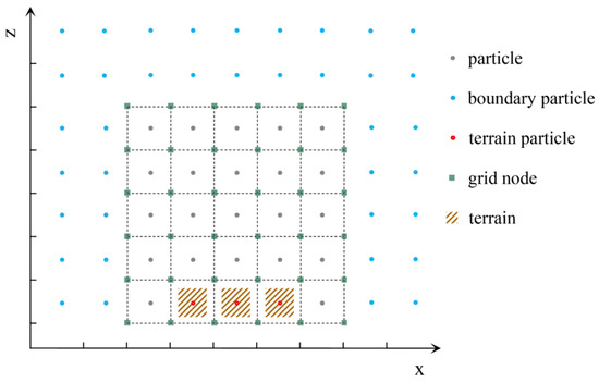 In the model, it is assumed that each terrain grid point corresponds to a virtual “particle”, referred to as a “terrain particle”. These “terrain particles” have a constant velocity of 0 but possess deformation values. This setup facilitates the computation of pressure gradient forces at the interface between the air and terrain.