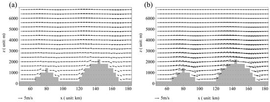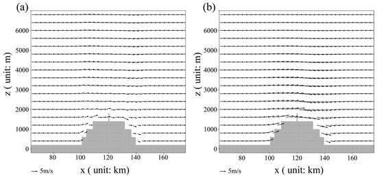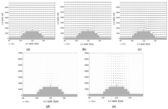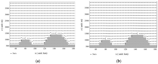 Using the terrain conditions depicted in Figure 13, assuming uniform settings of u = 5 m/s and w = 0 m/s at t = 0 s, with a time step of dt = 15 s, flow field changes were observed after 15 s.