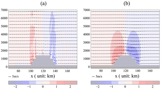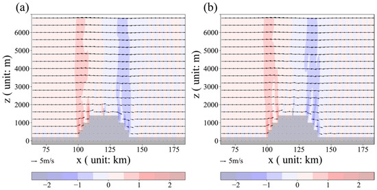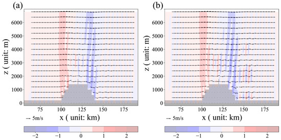 Wind fields output by the Euler–Lagrange model, with filled contour lines indicating the distribution of vertical wind speed. (a) Wind field at t = 1350 s; (b) wind field at t = 1800 s.