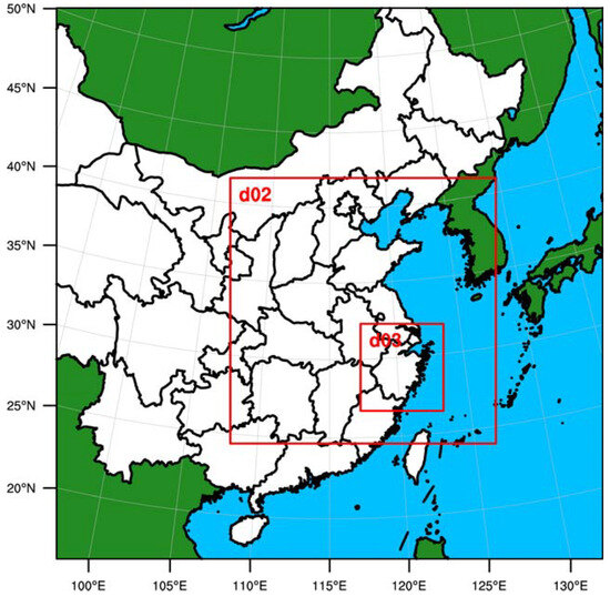 In this study, the WRF (v3.6.1) model is utilized to conduct a high-resolution numerical simulation of the primary precipitation event during a localized severe convective storm. The simulation employs a triple one-way nested grid structure (Figure 1), featuring vertical stratification across 50 layers, with the model’s top layer set at 50 hPa. The horizontal resolutions are meticulously set to 12 km (D01), 4 km (D02), and 1.33 km (D03) to capture the intricate details of the storm’s evolution. To accurately simulate the physical processes driving the precipitation, the simulation incorporates a suite of sophisticated parameterization schemes. These include the WDM6 microphysical parameterization scheme for detailing microphysical processes, the RRTM longwave and Dudhia shortwave radiation schemes for atmospheric radiation dynamics, the Yonsei University (YSU) scheme for boundary layer physics, and the Kain–Fritsch (KF) cumulus convection parameterization scheme, which is exclusively applied within the outermost grid (D01). To optimize resource use and computational efficiency while improving the simulation’s accuracy, the “ndown” method is employed. This technique facilitates the transfer of initial and boundary values from the model’s outer grid to its inner layers, ensuring consistency and enhancing detail in the simulation’s finer scales. The integration period spans from 00:00 to 18:00 on 31 July 2021 for the D01 and D02 regions, totaling 18 h. To refine the simulation outcomes further, the integration for the D03 region begins 6 h later, running from 06:00 to 18:00 on the same day, a total of 12 h. This staggered integration approach, detailed in Table 2, is meticulously designed to capture the complex dynamics of the severe convective rainstorm, offering insights into its development and potential impacts.