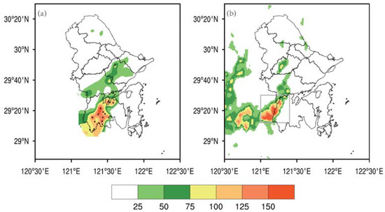 Distribution of the accumulated rainfall amount (shaded; unit: mm) during the rainstorm event for (a) observation from automatic weather stations and (b) simulated rainfall amount.