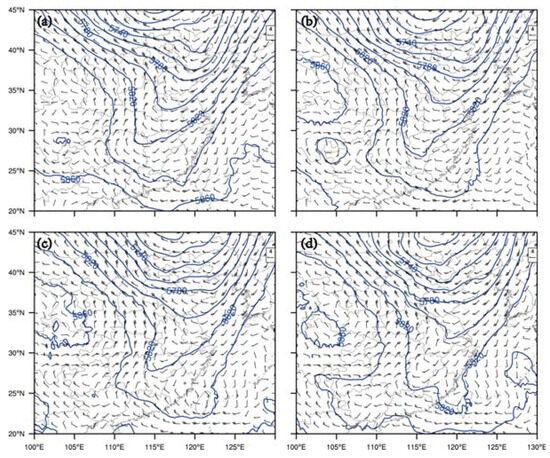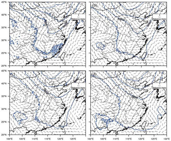 The 500 hPa geopotential height (thick blue lines, unit: gpm) and 850 hPa wind fields (wind bar, unit: m s−1) at (a) 0800 BST 31 July, (b)1400 BST 31 July, (c) 2000 BST 31 July, and (d) 0200 BST 1 August 2021.