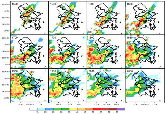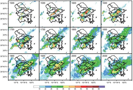 The combined radar reflectivity observed in Ningbo (shaded, unit: dBZ) from 1500 BST to 2230 BST 31 July in 2021.