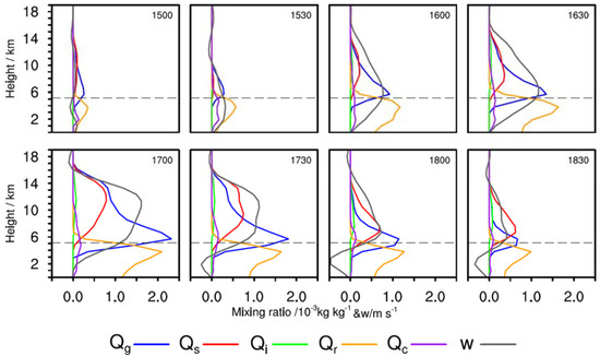 Area-averaged (29.2°~29.5° N, 121.0°~121.4° E) vertical profiles of hydrometeor mixing ratio ( for graupel, for snow, for ice, for raindrops, for cloud water, units: 10−3 kg/kg; w for vertical speed, unit: m/s) from 1500 LST (notation in the sub-figures: 1500) to 1830 LST 31 July 2021.